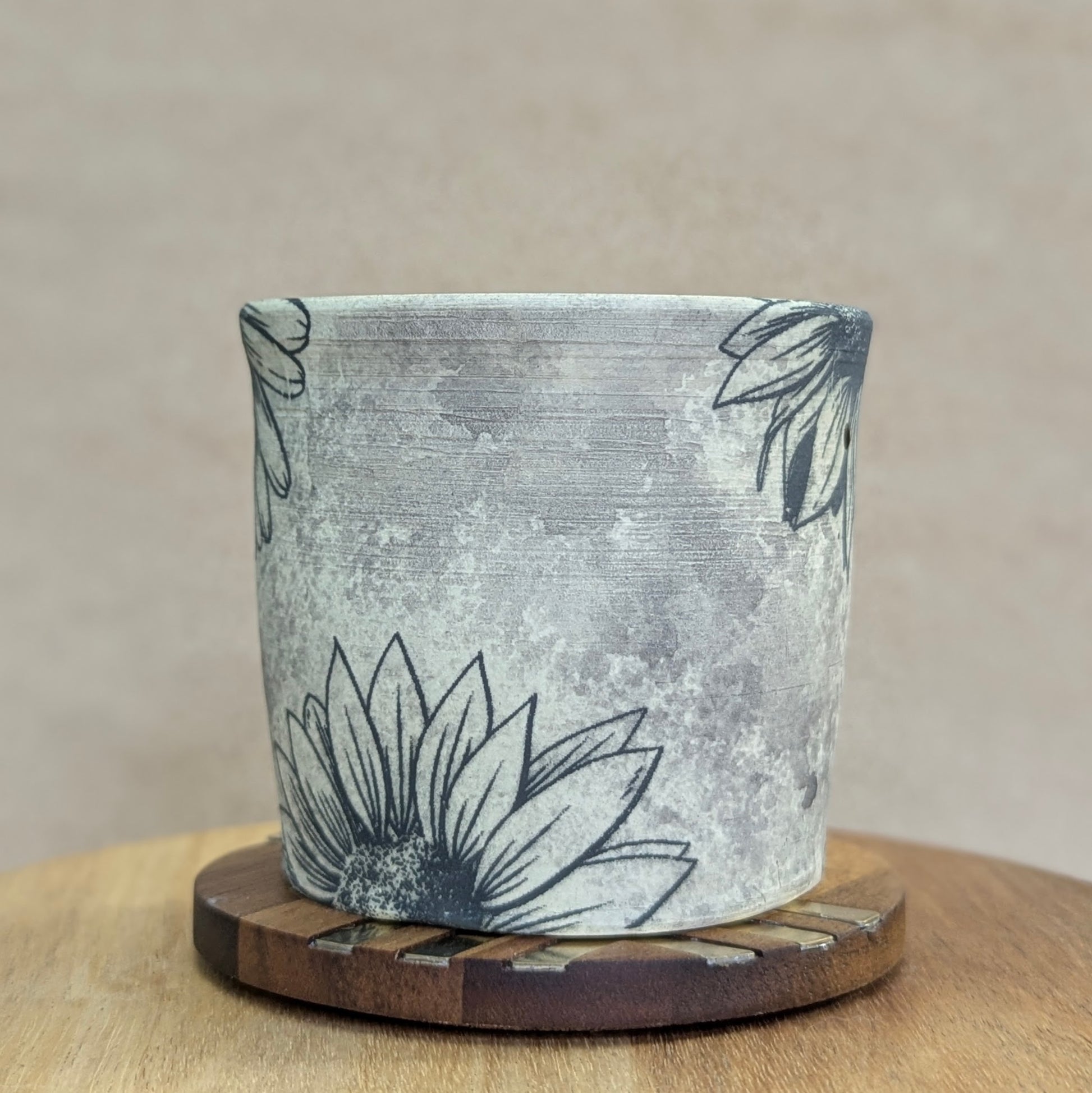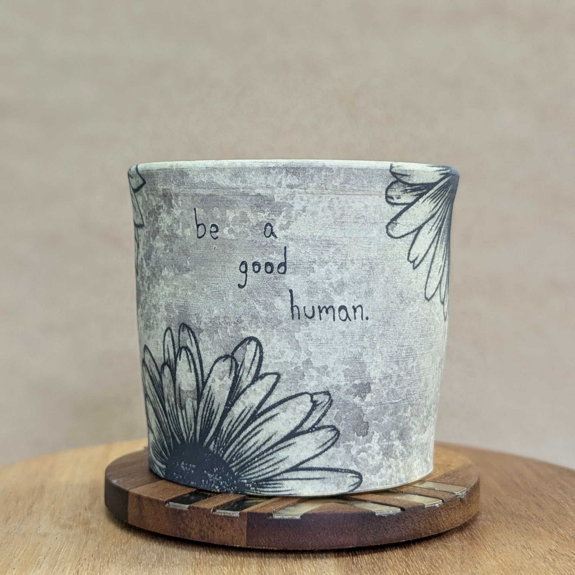 Handmade cup with "be a good human" displayed in black on a black and white distressed floral background. Glazed interior, unglazed exterior.