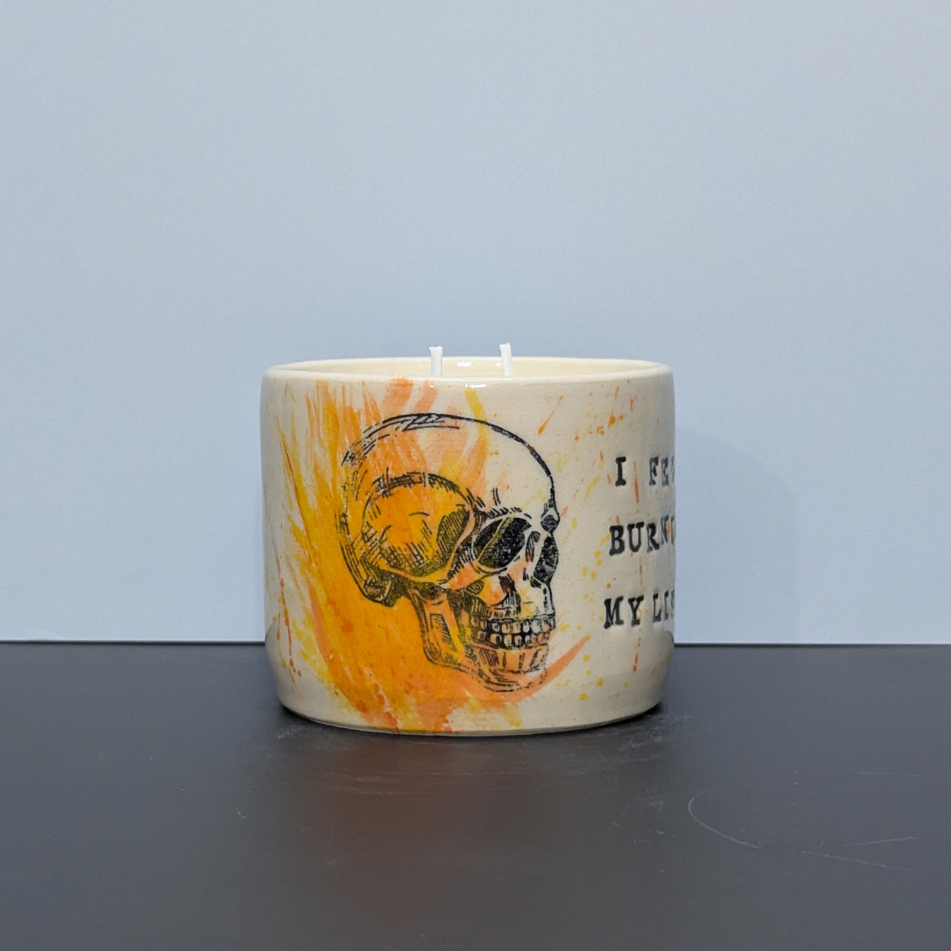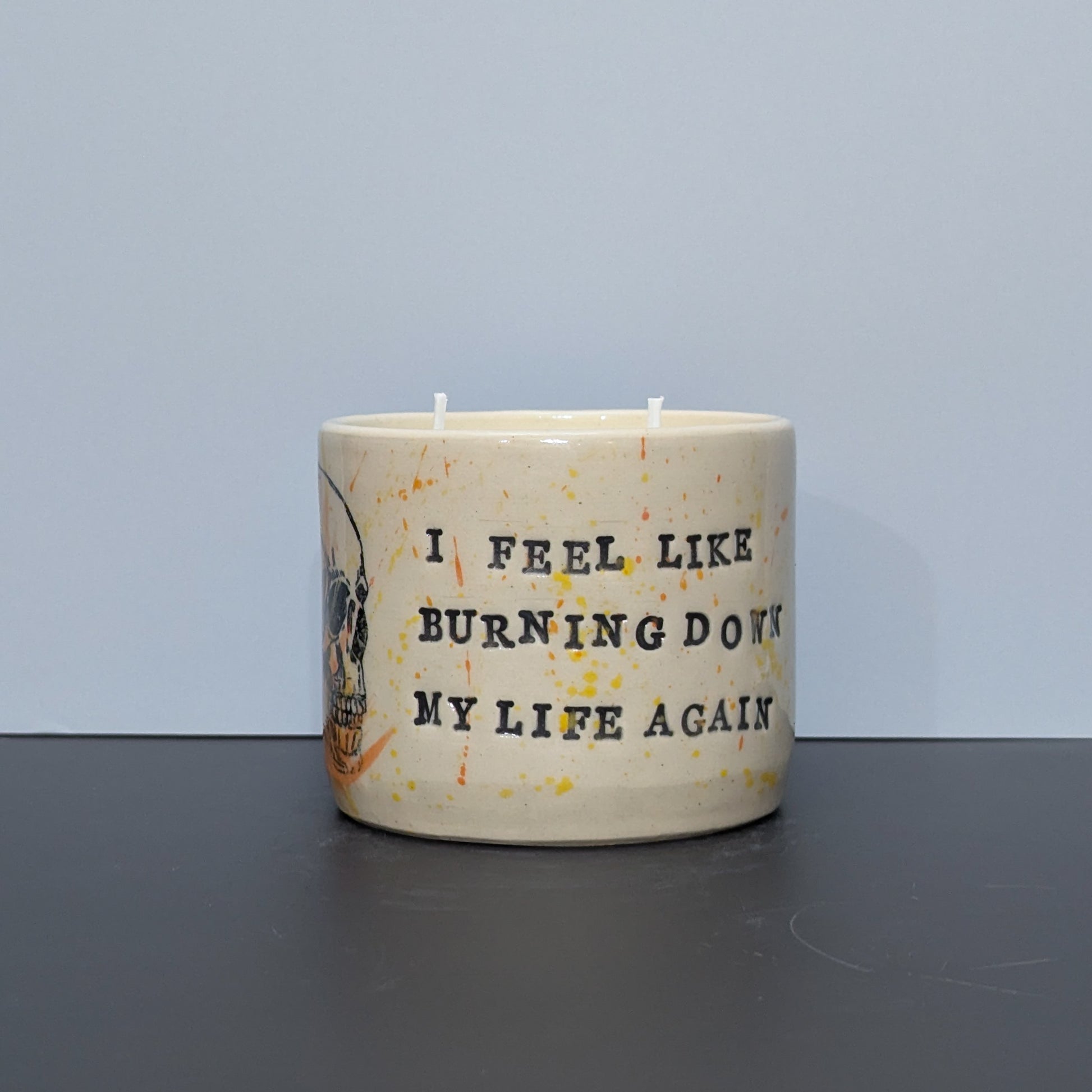 Handmade ceramic candle vessel with the lyrics "I feel like burning down my life again" from the song Brave Faces, Everyone by Spanish Love Songs in black stamped letters on an off-white background, accompanied by an illustration of a burning skull and splatters in yellow and orange tones. Candle is soy wax with two wicks. Smells like vanilla sugar and living paycheck to paycheck.