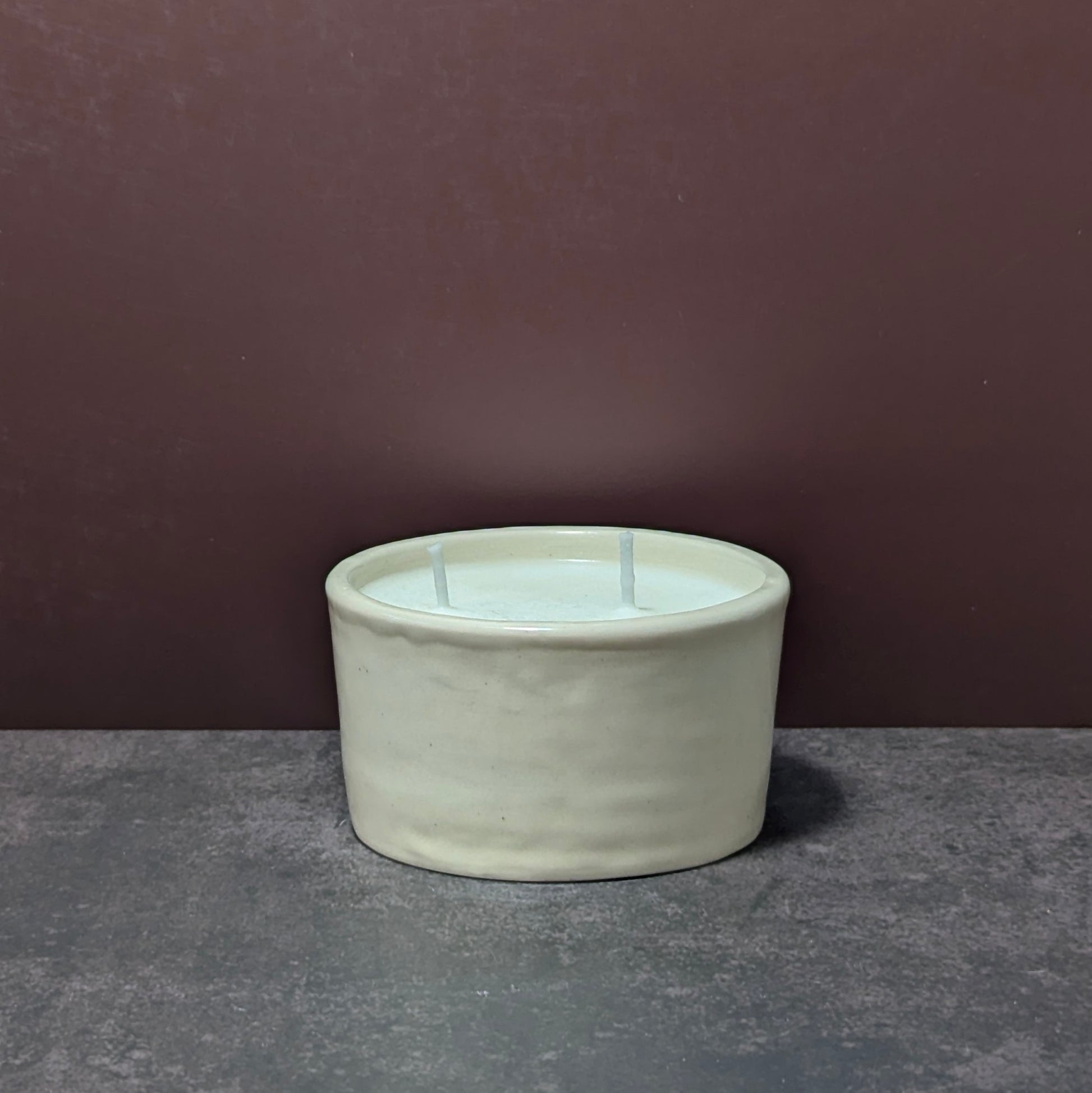 Handmade ceramic candle vessel with "they're burning all the witches ..... go ahead and light me up" in black stamped letters on white background. Candle is soy wax with two wicks in a vanilla sugar scent.