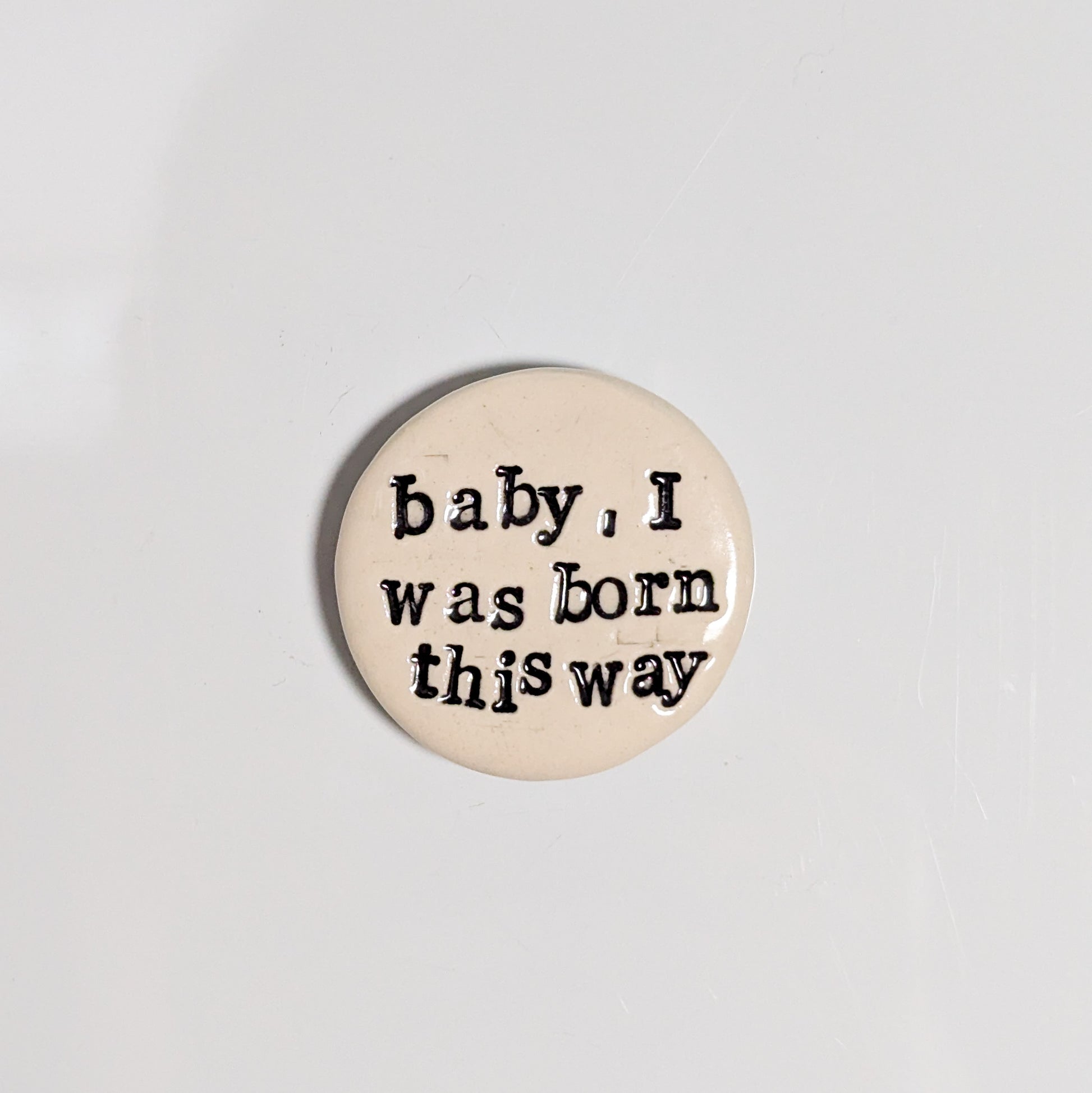 Single round ceramic magnet measuring approximately 1.75" in diameter. Hand-stamped black lettering reads, "baby, I was born this way"