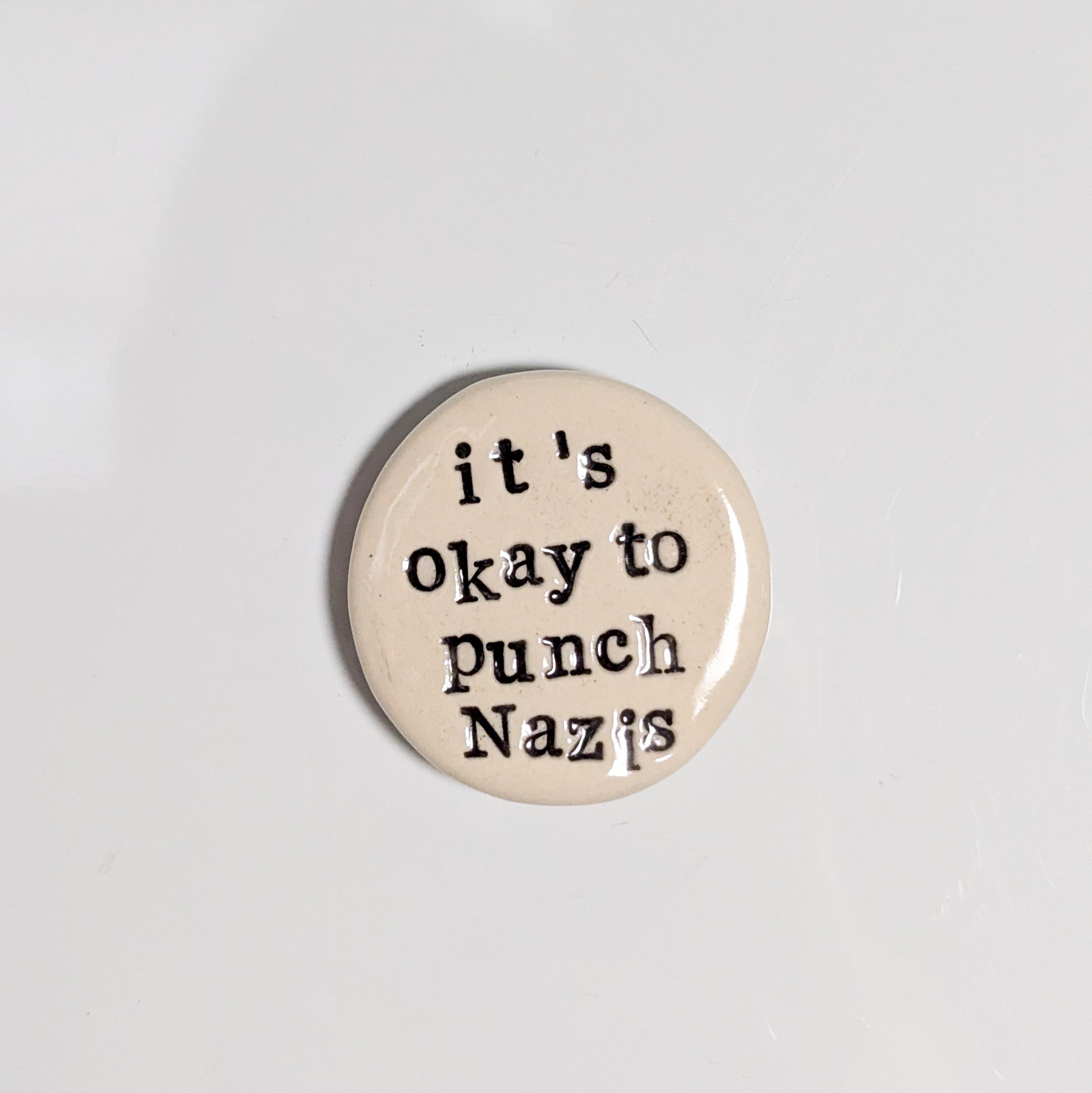 Single round ceramic magnet measuring approximately 1.75" in diameter. Hand-stamped black lettering reads, "it's okay to punch Nazis"