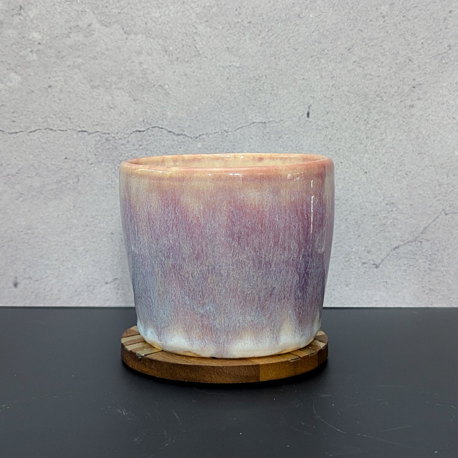 Handmade mini planter in a a flowing cream, lavender, and pearly white glaze, with drainage hole. Measures approximately 4" in diameter and 3.5" tall.