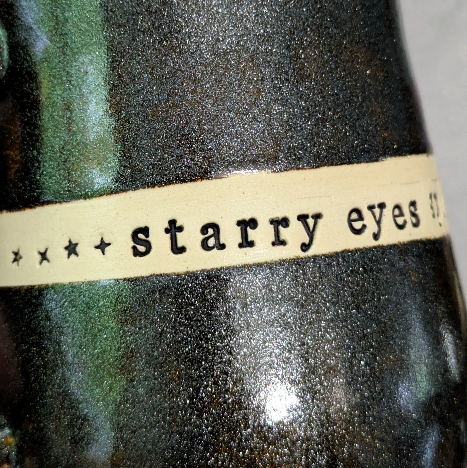 Handmade mug with "starry eyes sparking up my darkest night" hand-stamped in black lettering on a strip of unglazed white clay background between sections of a deep, sparkling metallic glaze.