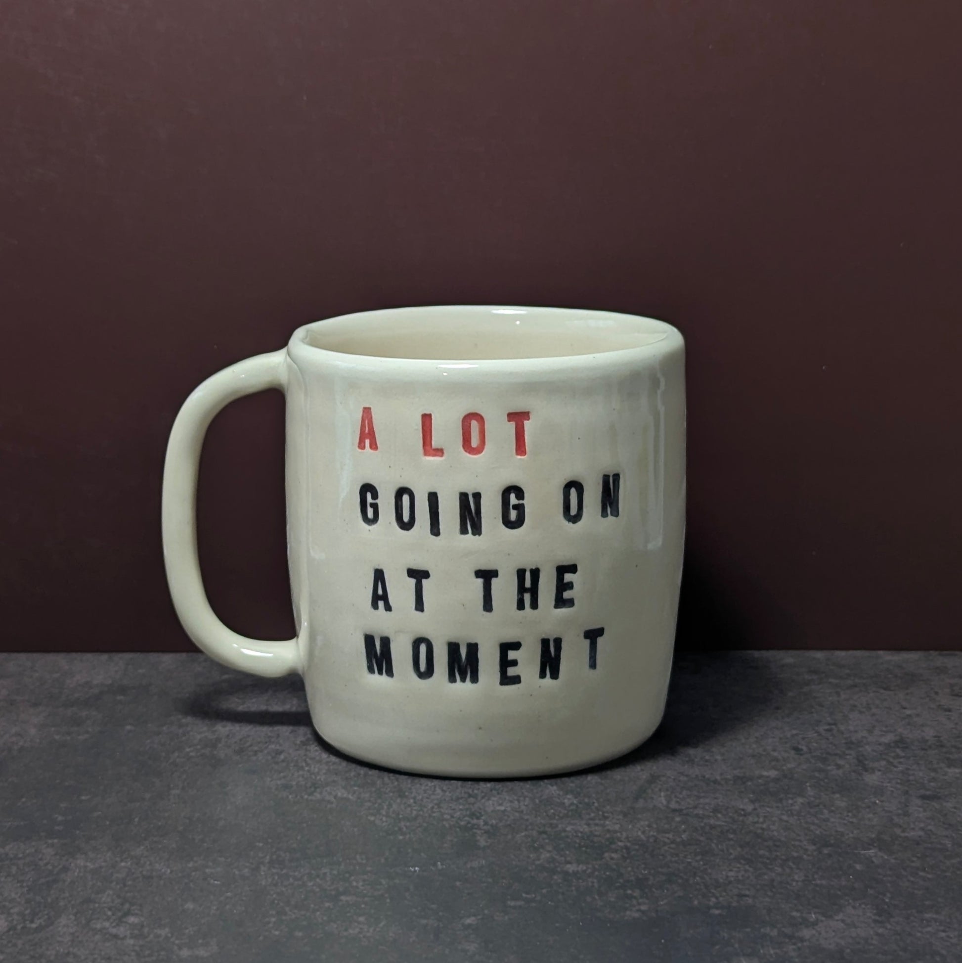 Handmade mug with "a lot going on at the moment" displayed in black and red on a white background.