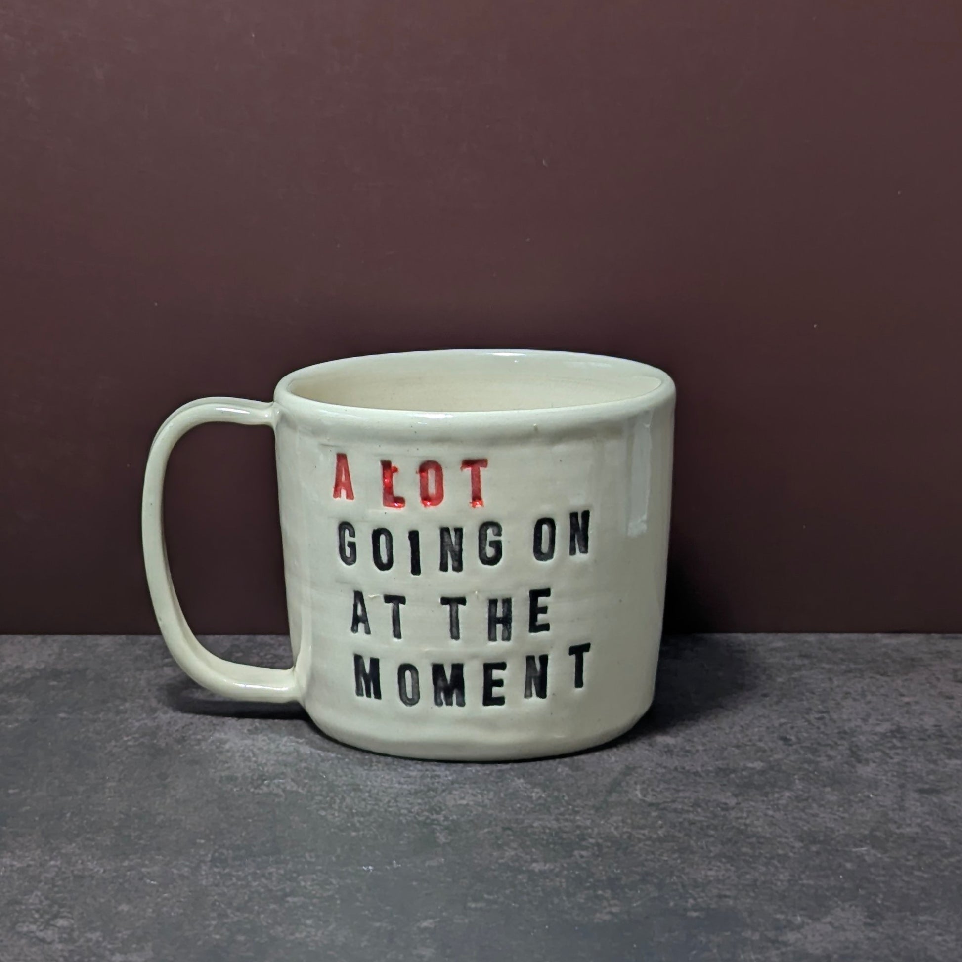 Handmade mug with "a lot going on at the moment" displayed in black and red on a white background.