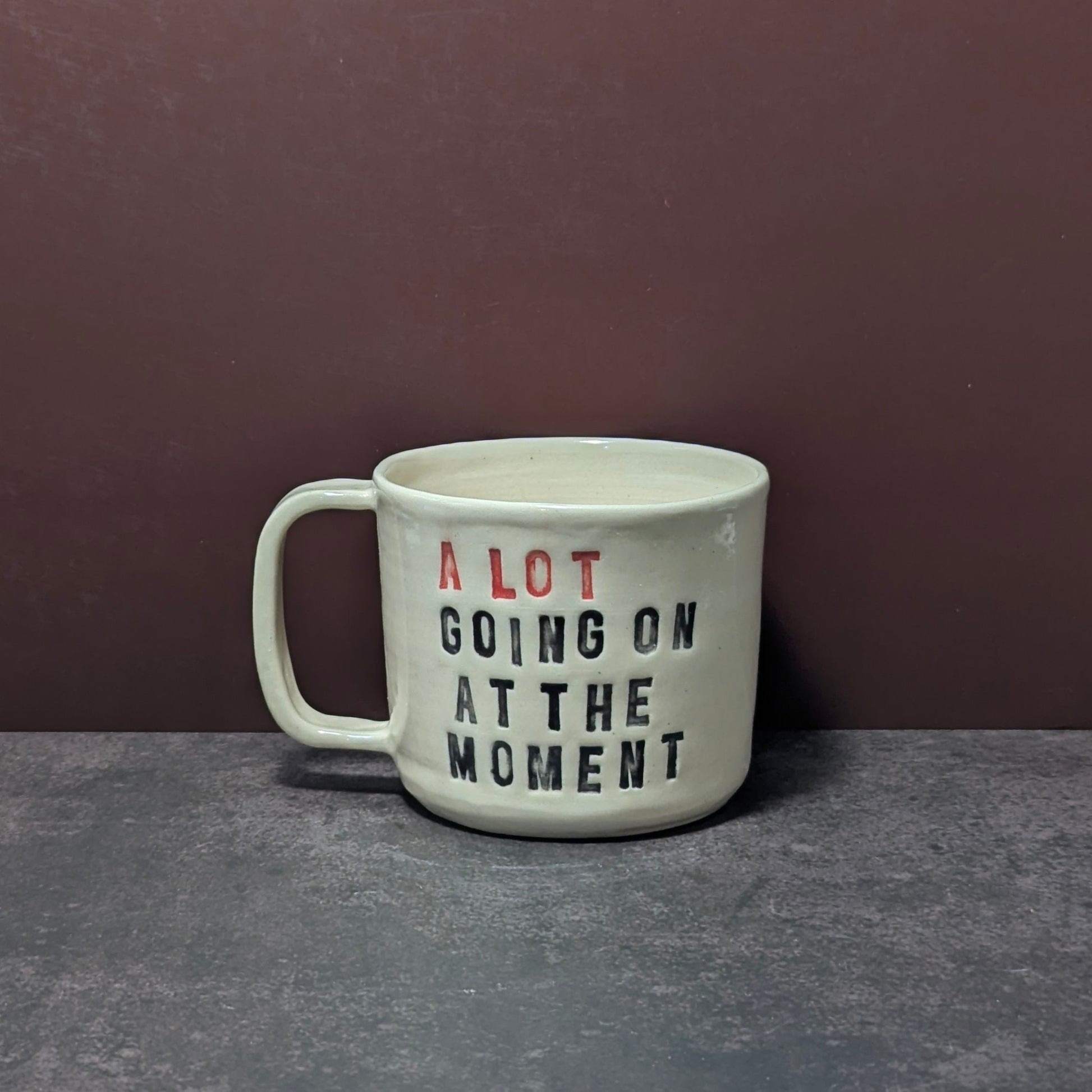 Handmade mug with "a lot going on at the moment" displayed in black and red on a white background.