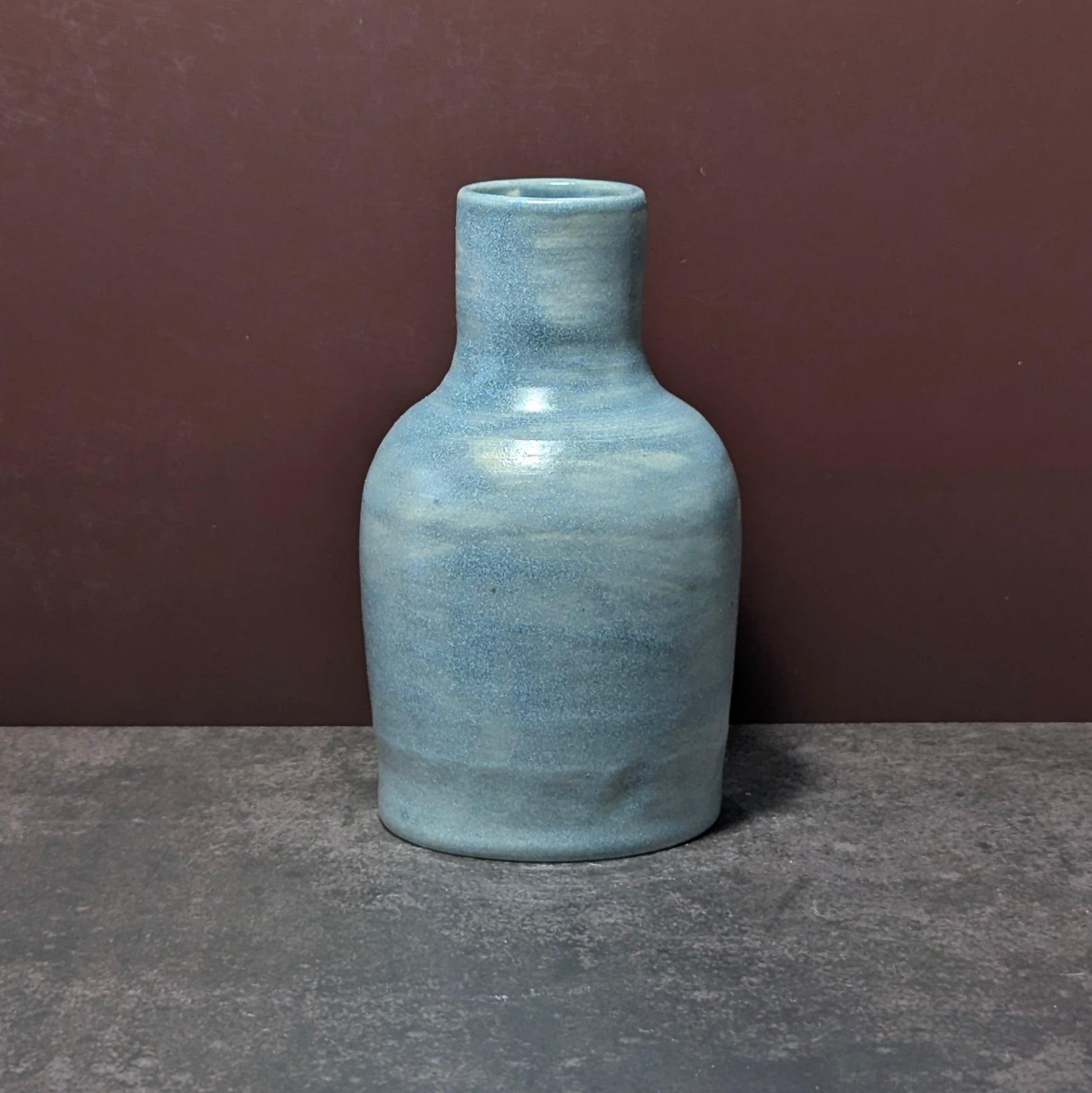 Handmade ceramic bud vase glazed with a blue satin oribe glaze.